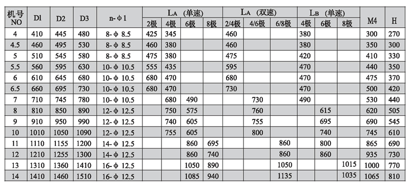 2.風機出廠時法蘭一般不打孔n-φ1僅供參考,若要打孔請用戶在訂貨時說明。