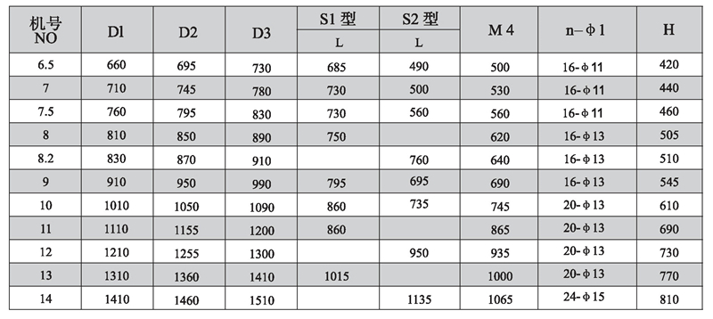 注:1、為了同用戶的安裝尺寸保持-致,法蘭打孔尺寸(n-φ1)僅供參考,若用戶沒有說明,本廠一般不打孔